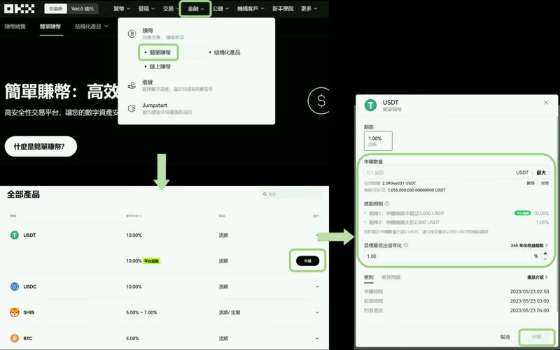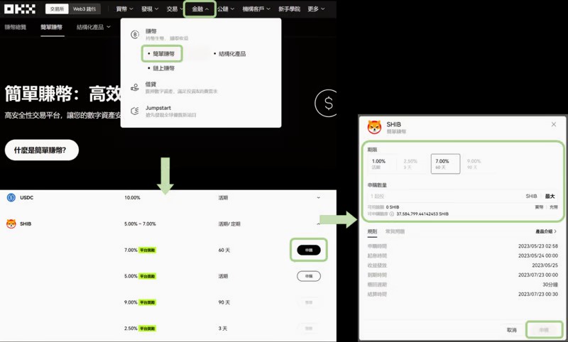 入口路径:金融→ 简单赚币→ 选择显示「定期」想申购的项目、参考年化/期限→ 点选产品列表右方「申购」申购产品→ 输入数量→ 点选「申购」