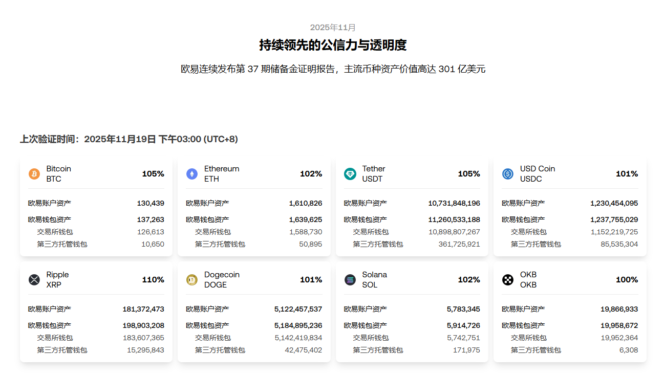 官网有最新的储备金率可看,OKX 每一个多月会更新一次最新数据。目前OKX BTC、ETH、USDT、USDC、OKB⋯⋯等币种储备金率全都超过100%。