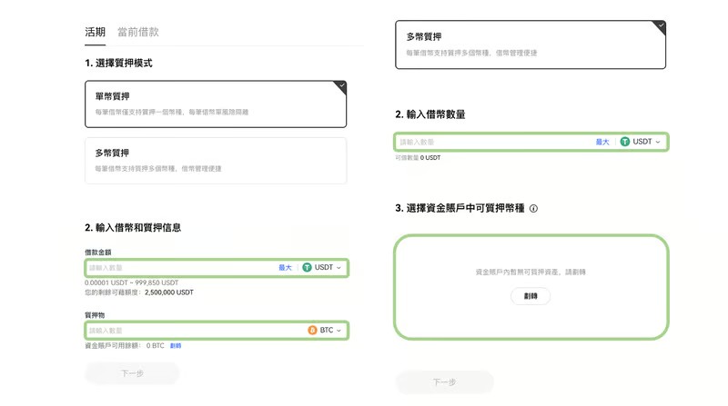 多币质押→ 输入借款数量和币种→ 选择帐户中可质押币种