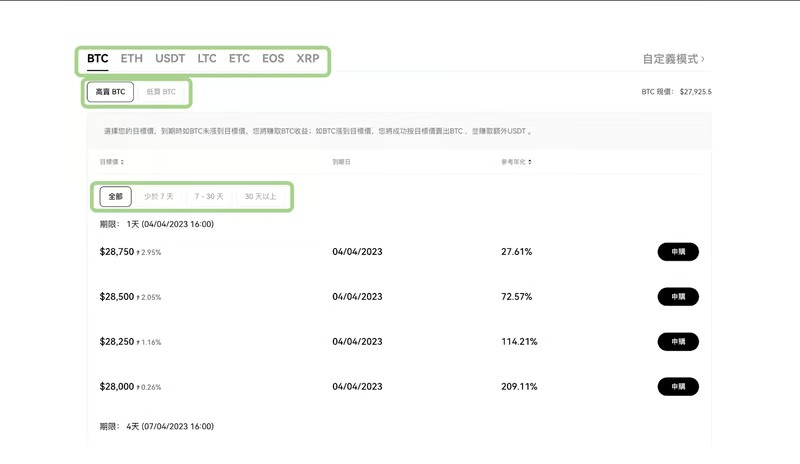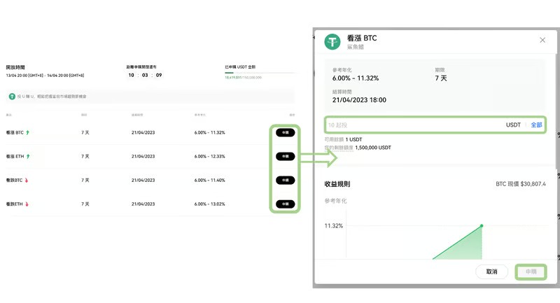 可选择投入BTC、ETH 及USDT 等币种、低买or 高卖;结算日会赚到一定的报酬,但报酬的币种& 数量会根据「到期时」用户欲买入/卖出的货币价格「是否达到目标价」而定。
