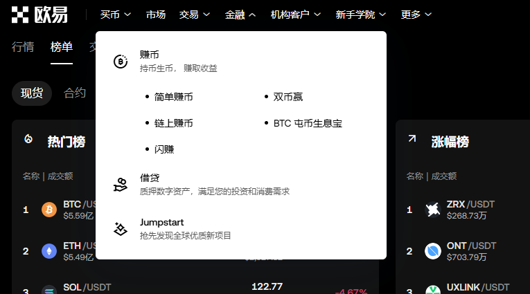 至官网首页,点选上方列表的「金融」,首先可看到「赚币」、「借贷」、「Jumpstart」三项功能。