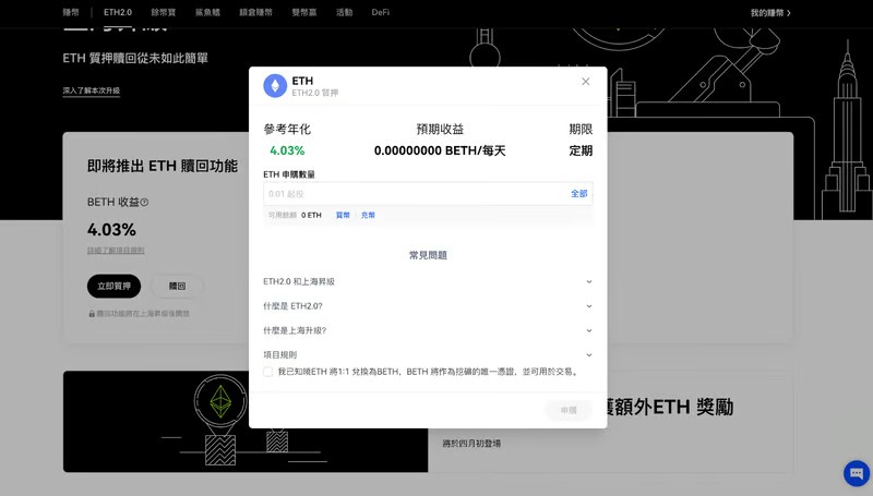OKX 提供用户免费质押ETH2.0,用户只需质押ETH 参与锁仓,即可赚取每日收益。