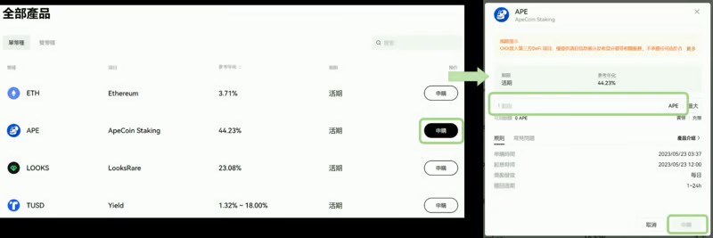 入口路径:金融→ 链上赚币,选择想申购的投资项目→ 确认年化、期限→ 输入申购数量→ 确认申购