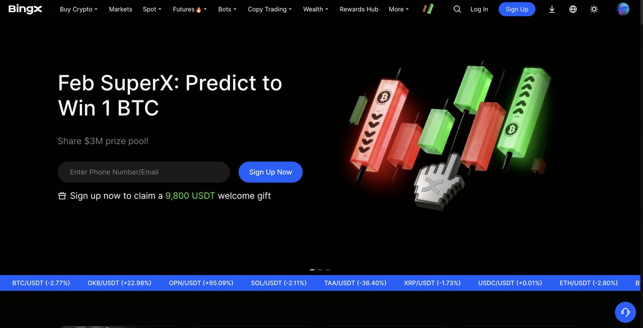BingX在2026年作为优先考虑低最低存款结合高流动性和成本效率的交易者的首选。该平台对大多数加密货币仅需1美元最低存款,几乎任何人都能以最小风险立即开始交易。它提供强大的流动性,24小时交易量经常超过13亿美元,横跨现货和 衍生品市场,由深度订单簿和已处理数千亿累计交易量的先进跟单交易工具支持。 BingX提供现货交易、永续 期货、创新跟单交易、如 BingX AI等AI驱动机器人、网格交易和被动收入产品,同时强调充满活力的社交交易生态系统。