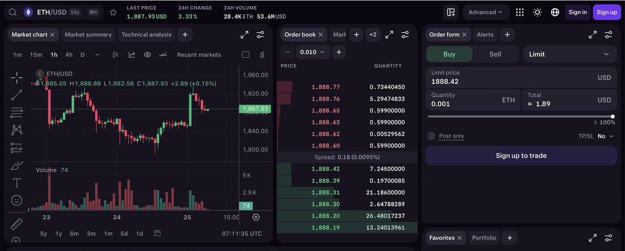 在以太币交易功能方面,Kraken 提供 ETH 现货、保证金交易与质押服务,让用户可在同一平台内完成持有与收益配置。其高端界面 Kraken Pro 支持完整订单类型与技术分析工具,较适合已有交易经验、希望对以太币进行波段或策略性操作的投资者。对于希望同时参与质押收益或长期持有的用户而言,Kraken 的集成度相对完整。