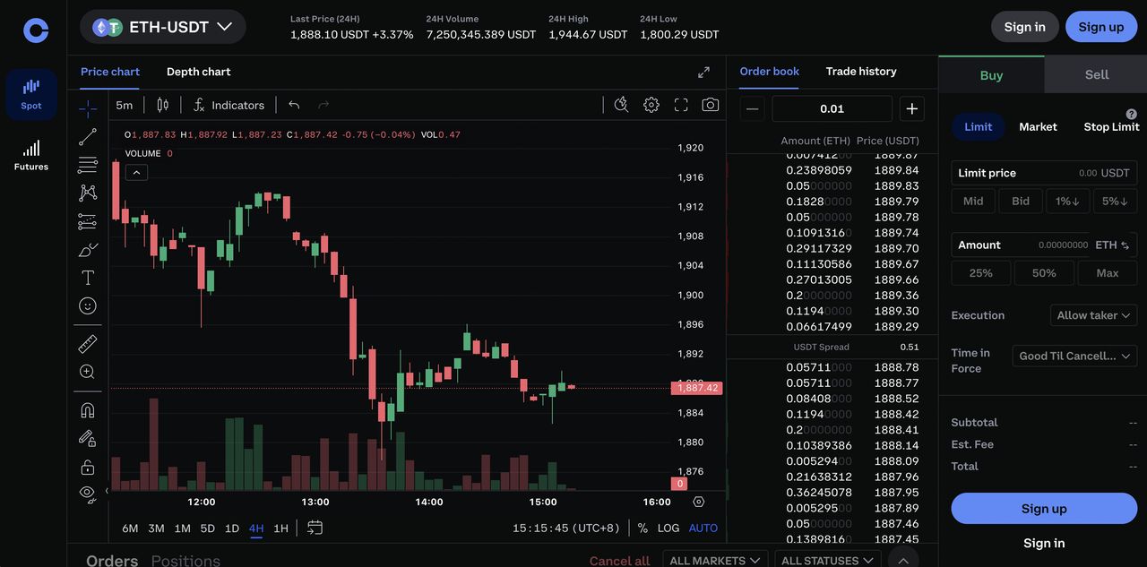 在 ETH 交易方面,Coinbase 提供现货买卖与 Coinbase Advanced Trade 高端界面,后者支持更完整的订单类型与较低费率,较适合有操作需求的投资者。截至 2026 年,Coinbase 管理资产规模约 5,160 亿美元,机构客户比例持续上升,显示其在大型资金配置以太币方面具备一定市场影响力。