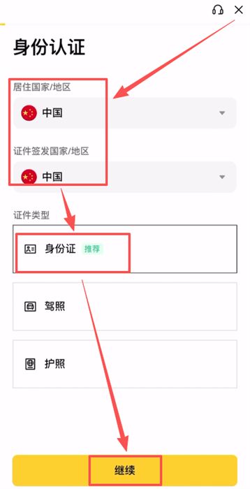 跳转到了身份认证的页面,居住国家或地区,以及证件签发国家或地区这里我们都可以选择“中国”。然后需要我们选择一下我们想要用来认证的证件类型,你是想用身份证、驾照还是护照,我这里就选择“身份证”,点击【继续】。