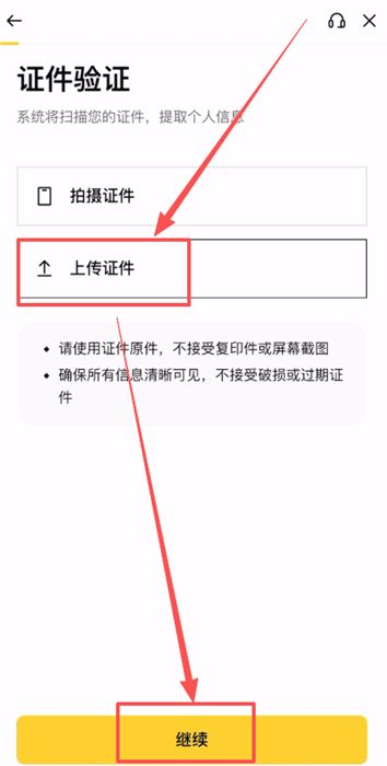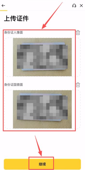 然后需要我们上传或者拍摄一下我们身份证件的正反面,选择上传,点击【继续】。