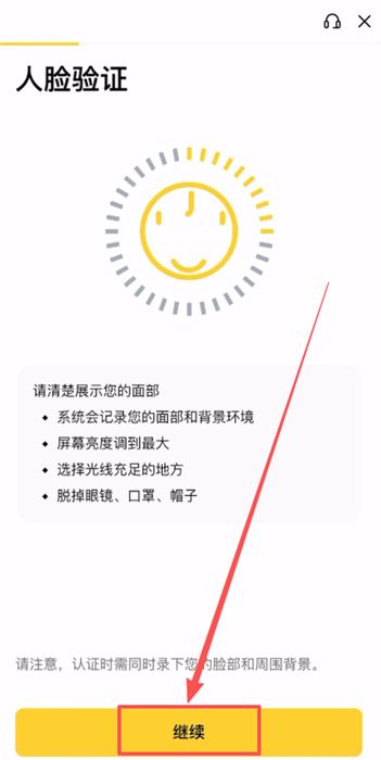 这个时候就到了人脸验证的环节,我们点击【继续】。