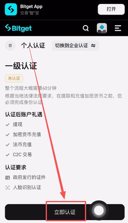现在我们的Bitget交易所的账号就已经创建好了,创建好之后就可以来进行身份认证了。点击立即认证。