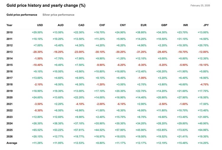 2010–2026年黄金价格走势及年度变化率(%)