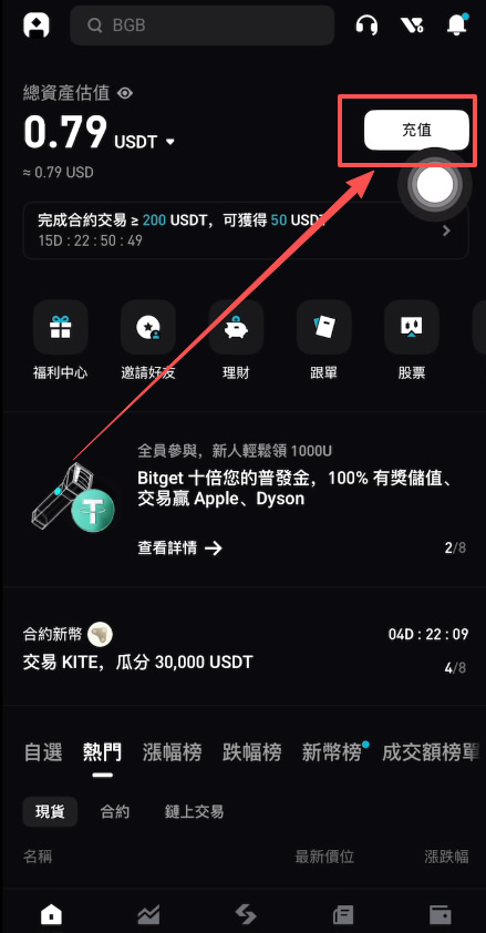 首先,我们打开Bitget交易所,点击上方的【充值】。