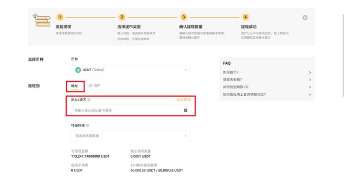4. 输入提现地址。您可以输入或者从地址薄中选择。