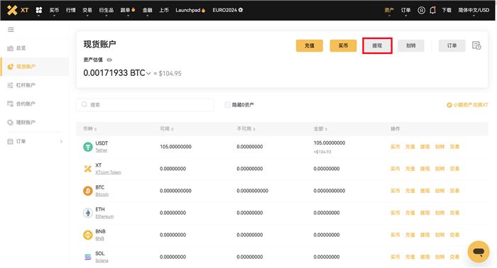 1. 登录XT账户并点击【现货账户】-【提现】。