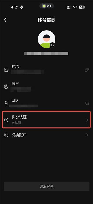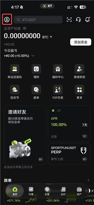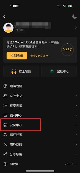 登录 XT App,点击左上角头像进入【个人中心】,点击【安全中心】。