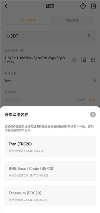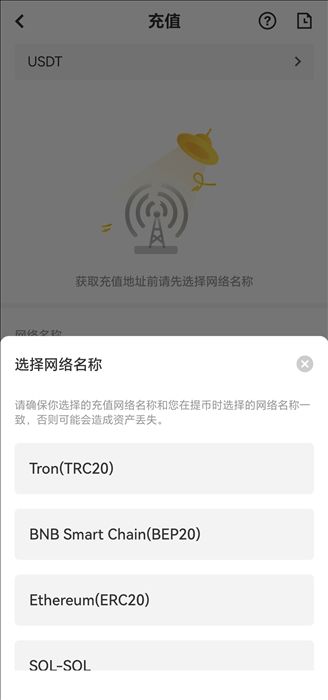钱包/平台的兼容:即对该网络支持,可选的网络取决于外部钱包/交易平台支持的选择。例如,如外部平台仅支持ERC20,则须选择ERC20充值网络。