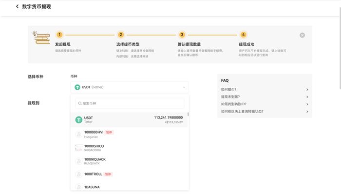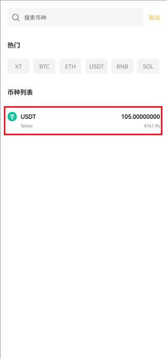 3. 选择要提现的加密货币,以USDT为例。