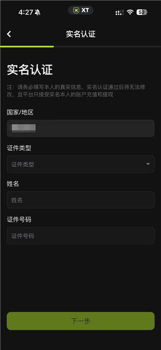 选择您的国家/地区。请注意,不同国家/地区有不同的限额和认证渠道。XT.COM支持Sumsub渠道或人工渠道,您可参考页面提示来确定您属于哪种认证方式。请确保您输入的所有信息与您的身份证件上的信息一致。