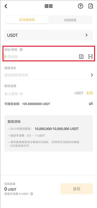4. 选择提现类型,选择【地址】。然后输入提现地址。您可以输入或者从地址薄中选择。
