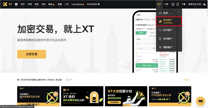 1.登录XT账户并点击【现货账户】-【充值】。