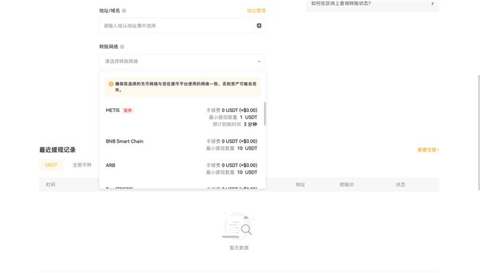 请确定收款平台/钱包支持您提现的代币以及使用的网络。如果您不确定,请在提现前与收款平台/钱包核实,否则您的资产可能会丢失且无法追回。