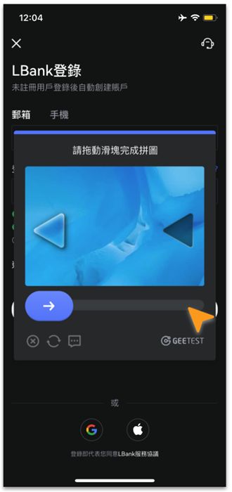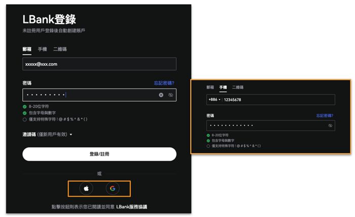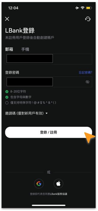 打开 LBank App,点击首页注册/登录直接进入注册页面。输入您的电子邮件地址或电话号码(或者使用第三方账户登录),设置您的登录密码,然后点击登录/注册。