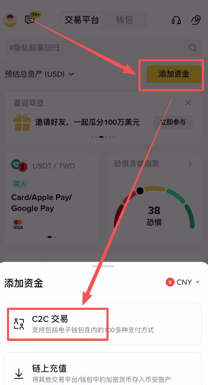 打开币安 App 首页,点击「添加资金」,选择「C2C 交易」进入入金页面。