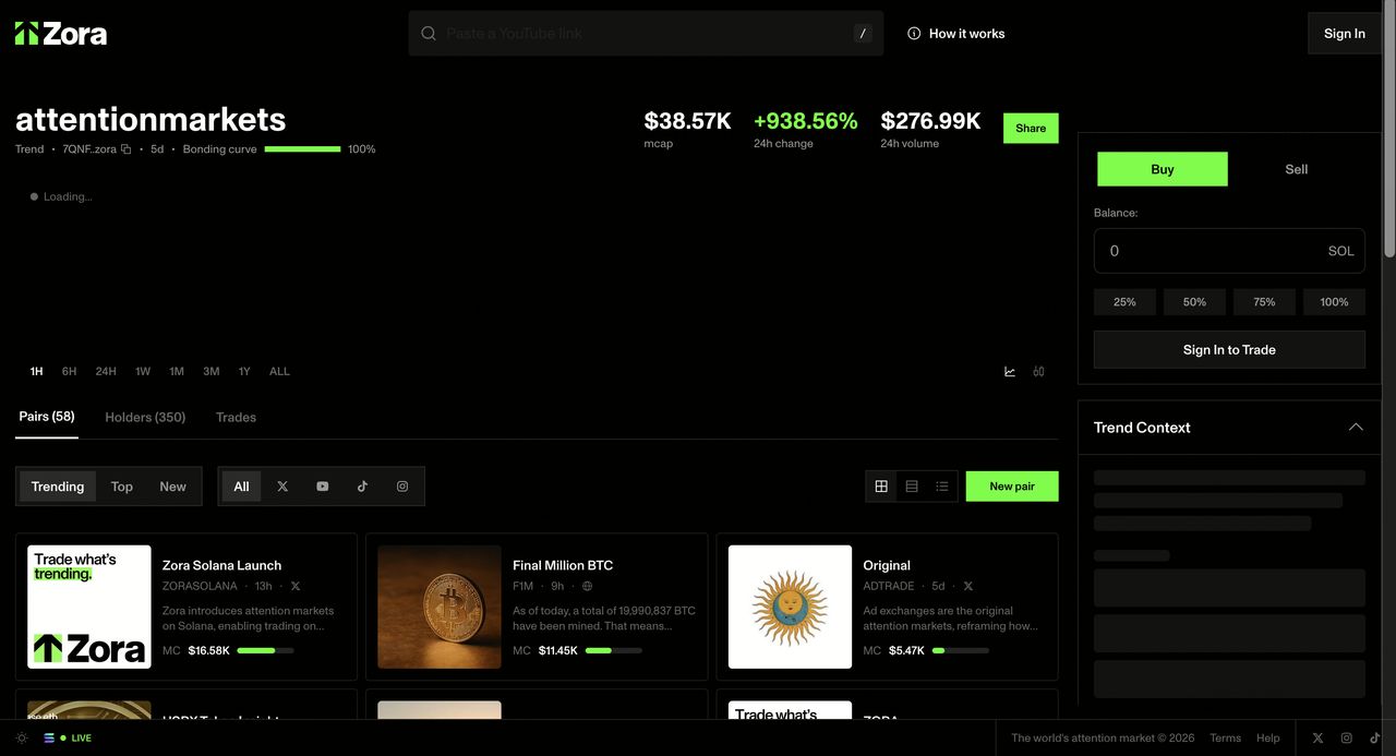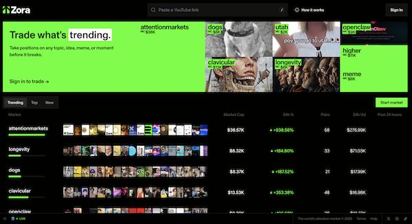 Zora注意力市场代表着一项突破性创新,将投机与网络文化融合在一起。该平台于2026-02-17推出,让用户能够对社交趋势、表情包、标签和话题的病毒式传播进行投注,将短暂的网络现象转化为可交易的资产。