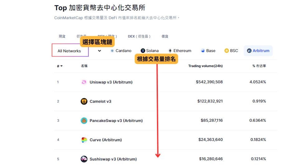 以上图为例,在 Arbitrum 区块链网络上,24 小时内交易量前三名的去中心化交易所分别是 Uniswap、Camelot、和 PancakeSwap。