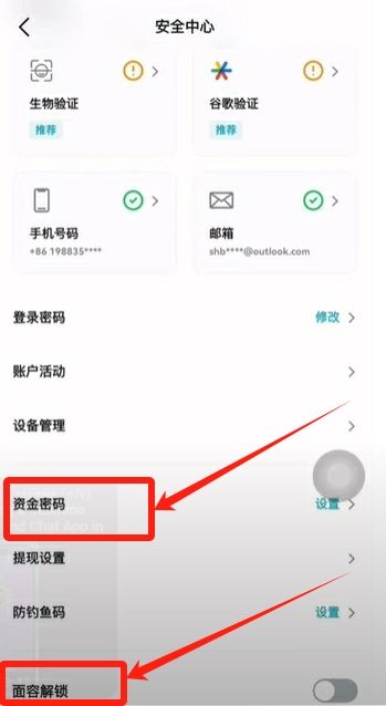 然后我们进入到安全中心,你们如果是邮箱注册或者手机注册,就把邮箱、手机跟谷歌验证器都过下,这样的话安全性会比较高。还有个生物验证,生物验证就是说转账直接扫脸就可以了,就会很方便。