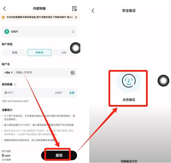 内部转账就是你知道对方注册bitget邮箱、手机或UID,那么你就可以进行转账了。点击验证,然后扫脸,他就直接把这个USDT转出去了。