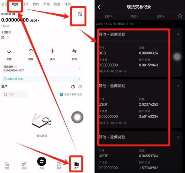 点击右下角的资产,上方点击现货,点击历史记录。可以看到他这边是有一个其他返佣奖励。bitget的返佣逻辑是这样子的,就是你在当天24点之前交易的,不管是现货还是永续合约,在第二天晚上9-10点之间,会给你进行返佣的。不管是现货还是合约,它是分好几笔进行返佣的。如果你们没有返佣可以把KYC释放出来,重新通过链接注册,就会有返佣的。
