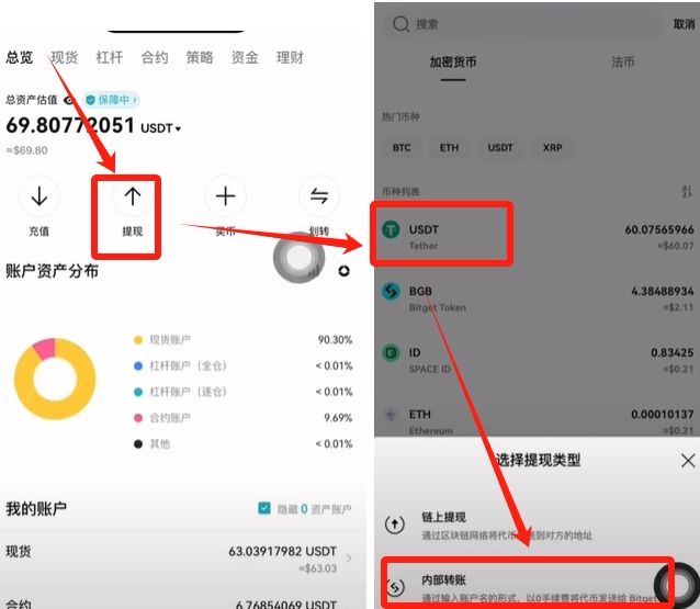 那我们演示一下提现,点击提现,币种USDT,点击内部转账。