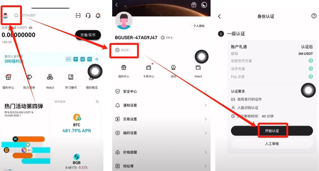 刚注册bitget账号,要进行一个KYC。刚登陆的时候左上角是有一个KYC直接进去进行KYC的。如果没有就点击左上角的人头,点击“未认证”,再点击开始认证,就可以拍自己的身份证正反面,加上自己人脸扫一下,10分钟左右就可以过KYC了,过了KYC才可以进行交易。