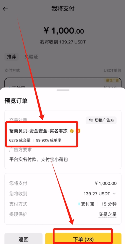 你有30秒的时间可以考虑是否跟这个商家进行交易。首先我们要看他的成交量以及它的成交率,然后点击【下单】。