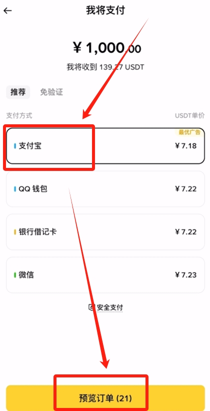 支付方式这里分别是支付宝、QQ钱包、银行借记卡以及微信。比如说我这里就选择最优的支付宝,然后点击【预览订单】。