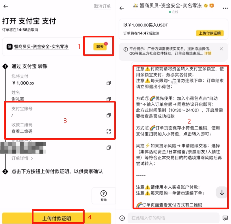 我们是可以看到商家的姓名,以及他的支付宝账号和他的收款二维码的。我们就可以离开平台,去到支付宝里面给他转行。转账完成之后需要我们截图一下,上传付款证明。这样商家那边确认之后,就会把币从平台放给我们了。