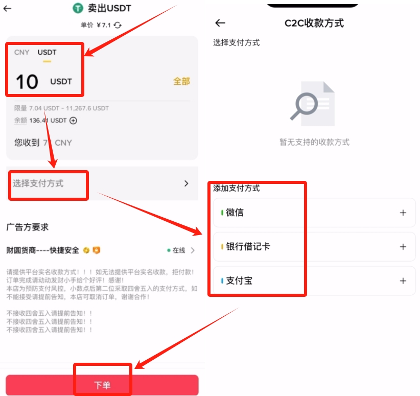 然后输入我们想要卖出的金额,或者是想要卖出的USDT的数量。点击【选择支付方式】,这样就可以添加一下我们的微信或者银行卡或者是支付宝,我们可以去添加一下。确认没有问题之后,就可以点击【下单】。