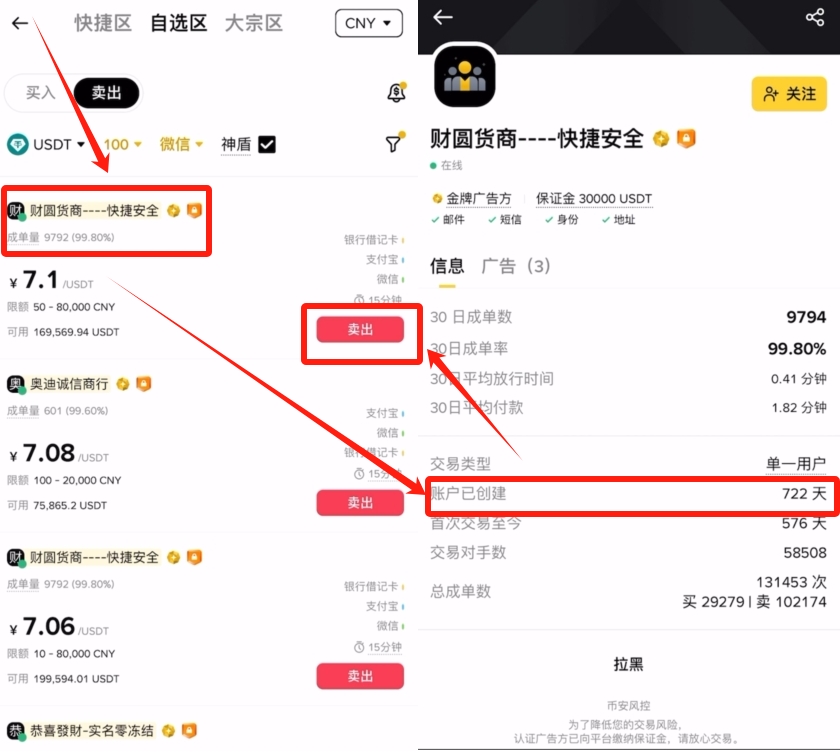 接下来我们要看的第一个点就是他的成单量以及成单率,当然是越高越好。然后点开他的主页,看一下他成为商家的时间,也就是账户已创建。我们可以看到722天,我们就要找这种注册时间比较久的商家,因为他的账户存活的时间越久,就证明他的资产越安全。确认跟他交易之后,点击右边这里的【卖出】。