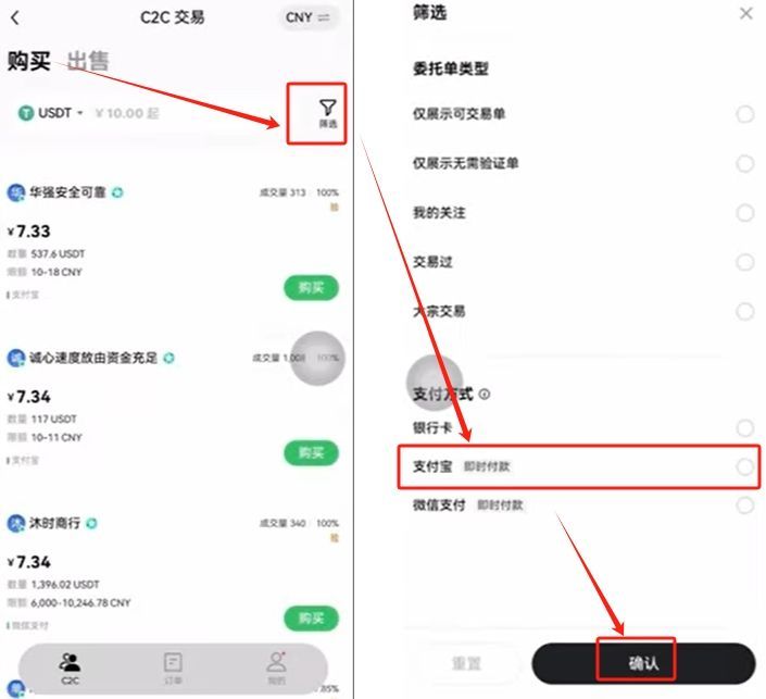点击上方的【出售】,筛选支付方式,我刚才用支付宝买的,这里还是用支付宝收,选一下“支付宝”,点击【确认】。输入数量,这里你要出售多少U就在这里输入你要出售多少U。