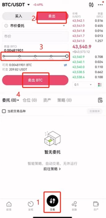卖出的话还是跟刚才一样,点击下方的【交易】按钮,选择【卖出】。再选择一个红色的价格,输入卖出的数量,点击【卖出BTC】,这时候就显示出了卖出的单子。我们现在就已经卖出成功了,我们的BTC就又变回了USDT。买币卖币在这里就演示完成了。
