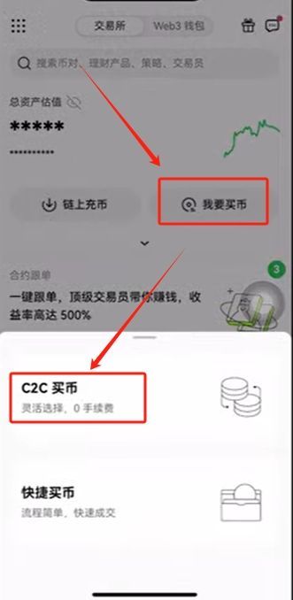 点击首页的【我要买币】,选择【C2C买币】。