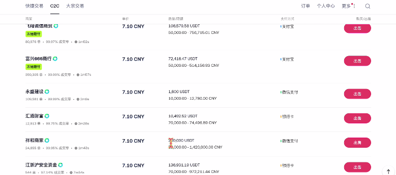 现在我的收款方式就已经添加好了,接下来就可以筛选商家进行出售的交易了。这里我就以卖500U为例,因为500U是100%包赔的。我来给大家演示一下这个过程。