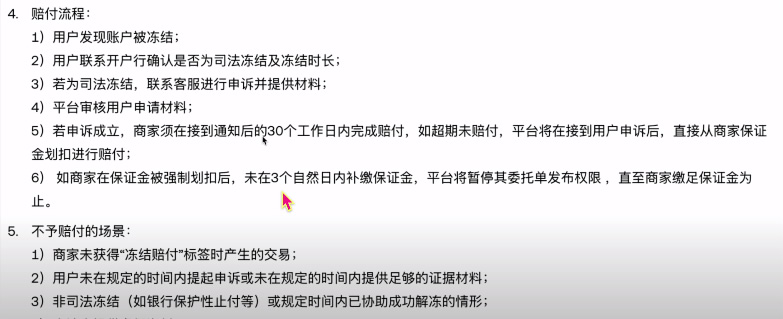 赔付的流程就是,如果你发现账户被冻结了,你要确认这个冻结是司法冻结,以及它的冻结时长。你去准备一下相关的材料,然后找平台进行申诉。平台审核通过之后,就会让商家来对你进行赔付。如果商家不给的话,因为商家在平台上是有质押保证金的,通常是30000U,所以他赔付的上限是30000U,就把这个保证金赔给你。