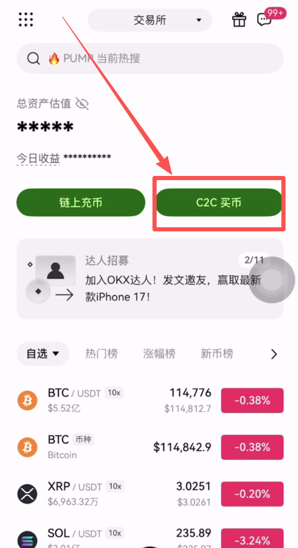 进入欧易APP之后,我们在欧易的首页,点击【C2C买币】。