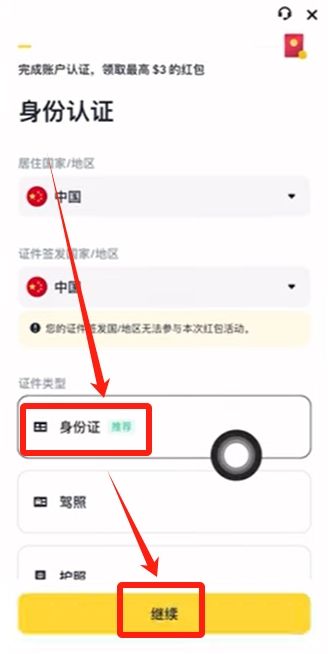 然后我们就到了身份认证的界面,接下来就需要进行身份认证了。如果你是中国的身份,可以使用身份证或者是护照来进行认证。推荐大家优先使用身份证来进行认证。然后点击【继续】。